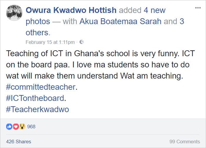 Geçen hafta yaptığı Facebook paylaşımıyla sosyal medyanın gündemine oturan öğretmen, “Gana okullarında ICT( Bilgi ve İletişim Teknolojileri) öğretmek çok eğlenceli. Kara tahta üzerinde bilgisayar dersi yapıyoruz. Öğrencilerimi çok seviyorum. Bu yüzden onlara öğrettiğim şeyi anlamalarını sağlamam gerekiyor” ifadelerini kullanarak, ders esnasından kareler paylaşmıştı.