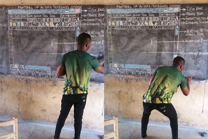 Fotoğraflarda, daha önce görsel sanatlar eğitimi alan Kwadwo’nun sınıf tahtasına tebeşirle bir Microsoft Word sayfasını tüm ayrıntılarıyla çizdiği görülüyor.